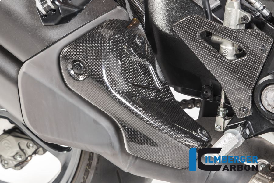 Il protezione termica dello scarico in carbonio, finitura lucida, per la Ducati Monster 1200 R sostituisce il componente originale utilizzando i punti di fissaggio originali. L'accento è posto sul risparmio di peso (di solito un risparmio di circa il 70% rispetto al componente originale) e su una maggiore rigidità.